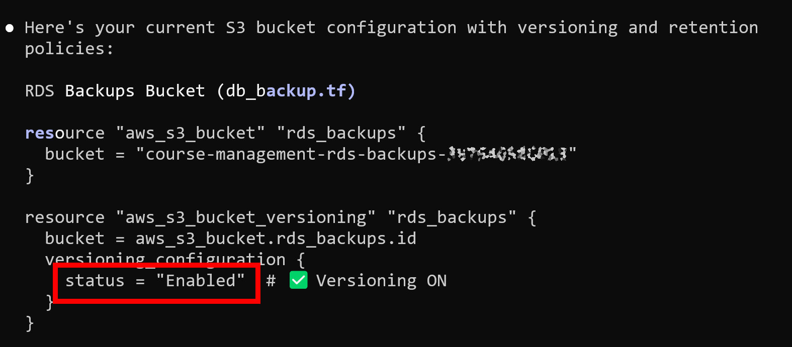 For S3 backups, I enabled versioning. If something is deleted, previous versions remain available. Deleting a bucket also requires first deleting its contents, which adds another barrier.
