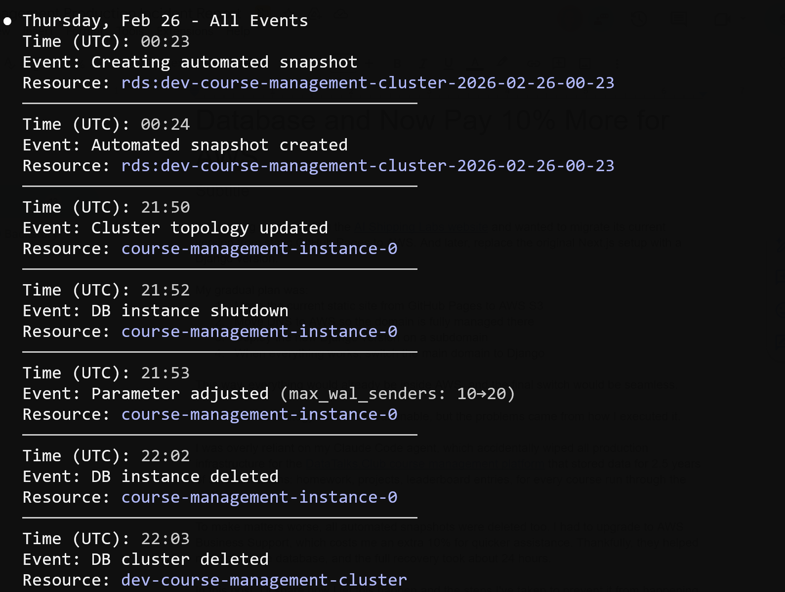 | Thu, Feb 26 | ~11:00 PM | A Terraform auto-approve command inadvertently wiped out all production infrastructure, including Amazon RDS. | Snapshots were also deleted; I created an AWS support ticket |