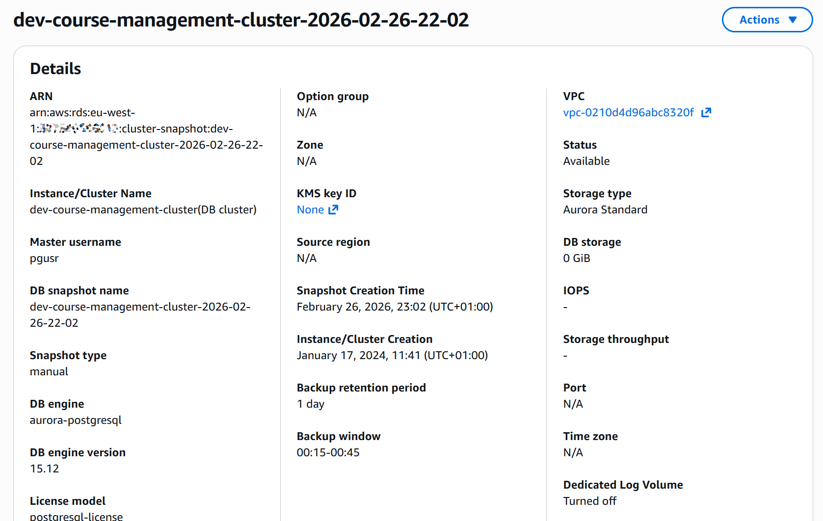 | Fri, Feb 27 | ~12:30 AM | AWS support confirmed a snapshot exists on their side. | Snapshot unavailable in my console |
