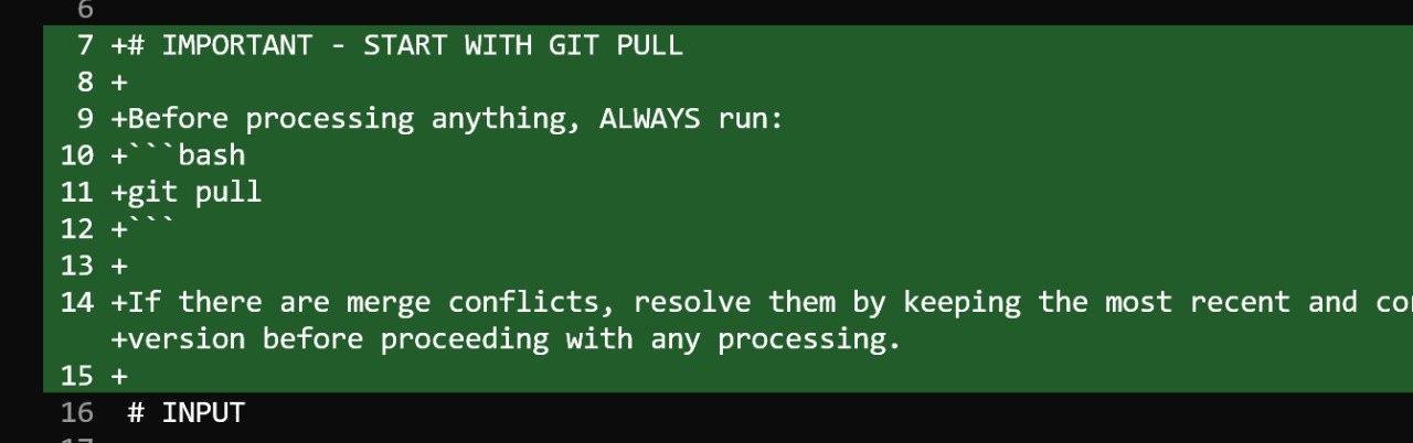 All updates are committed to a GitHub repository. Each processing run results in a concrete diff that shows exactly what changed. The agent can also follow natural-language instructions such as running git pull before processing to ensure it is working with the latest state.