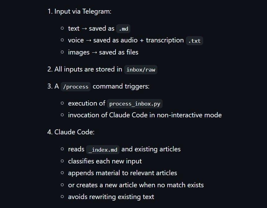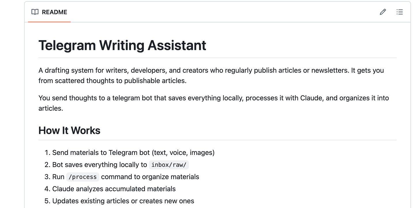 To help myself capture that background work, I built a Telegram-based writing assistant using Claude Code agents. It can process my raw voice notes, files, and text messages into structured articles and store them in a GitHub repository.