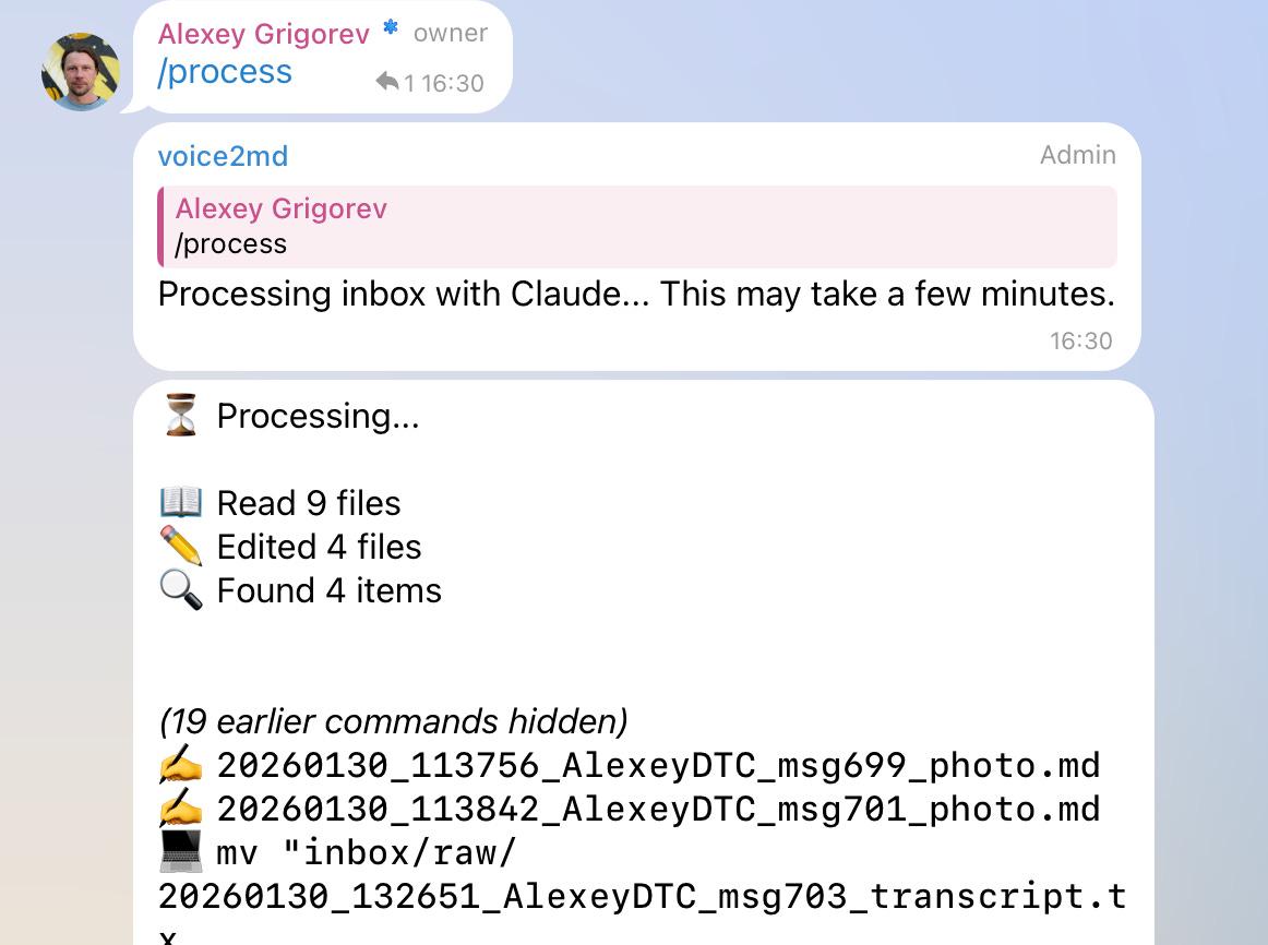 In practice, voice notes are often recorded in Russian, while articles are written in English. During processing, Claude translates all content into English, which is treated as the target language for articles. This removes language constraints from the capture phase.