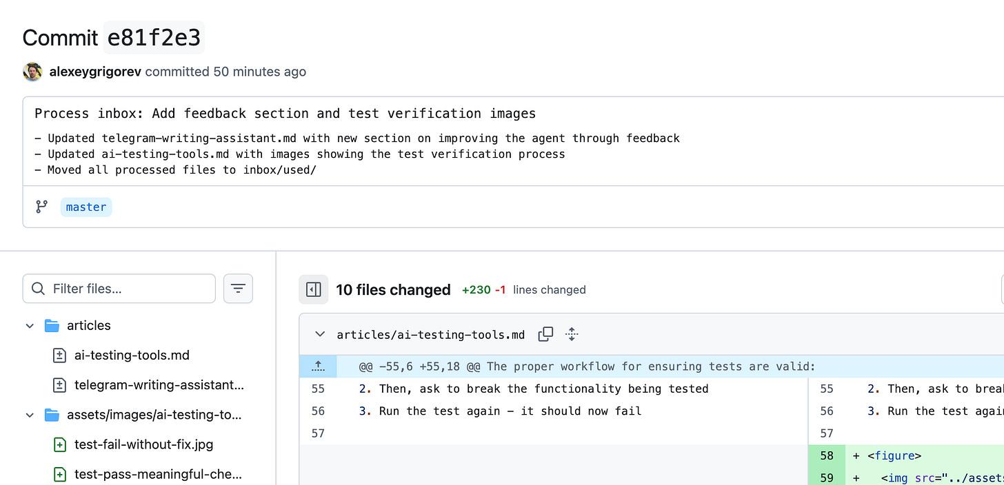 Once processing is complete, all changes are committed to a GitHub repository. The commit is created by the assistant. It shows what it changed and why. The agent also sends a link to the commit back to the Telegram chat.